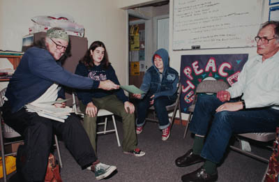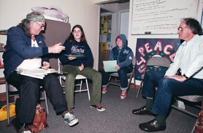 VFP members S. Brian Willson (left) and Bill Thompson recognize two Arcata High School students who dared to protest their high school's involuntary "Patriot's Day" assembly on the first anniversary of 9/11, and walked out of school on October 7, 2002 to participate with HSU students protesting the U.S. war on Iraq.