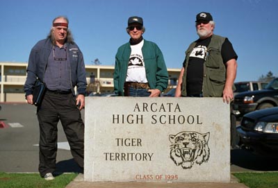 On a separate occasion, VFP members Steve Stamnes, S. Brian Willson, and Bill Thompson stand in front of Arcata High School before speaking to students about their military experiences.