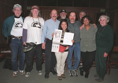 L to R: Bill Thompson, S. Brian Willson, Councilman Dave Meserve, 'Nate' Lomba (back), Japanese peace activist Yumi Kikuchi (front), Councilman Bob Ornelas, Steve Stamnes, Mayor Connie Stewart, June Thompson.