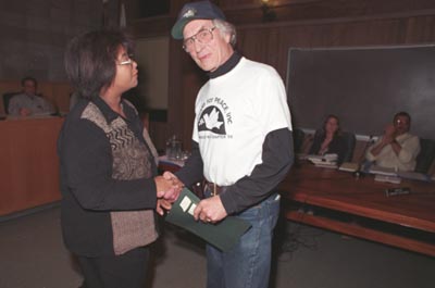 After a unanimous vote (with one absence), Arcata Mayor Connie Stewart presents VFP President Bill Thompson with a signed copy of the city's "Resolution to Ban the Use of Depleted Uranium," urging a ban on the manufacture and use of DU weapons by the U.S.