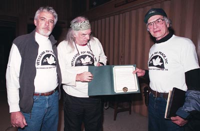 VFP Chapter 56 members Steve Stamnes, S. Brian Willson and Bill Thompson hold up Arcata's Resolution to Ban the Use of Depleted Uranium.