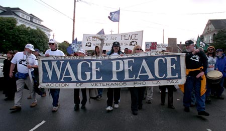 Vietnam veteran Brian Willson leads the VFP contingent on his hand cycle.